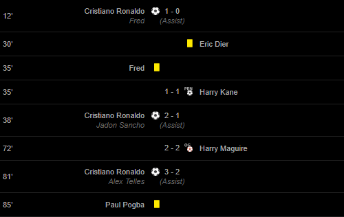 Goals: 12′ Cristiano Ronaldo (Fred(Assist)) / 35′ Harry Kane / 38′ Cristiano Ronaldo (Jadon Sancho(Assist)) / 72′ Harry Maguire / 81′ Cristiano Ronaldo (Alex Telles(Assist))