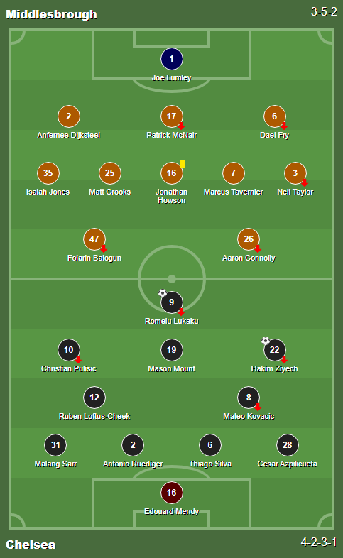 Goals: 15′ ((Assist)Romelu Lukaku) Mason Mount / 31′ ((Assist)Hakim Ziyech) Mason Mount
