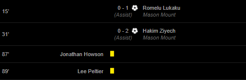 Goals: 15′ ((Assist)Romelu Lukaku) Mason Mount / 31′ ((Assist)Hakim Ziyech) Mason Mount