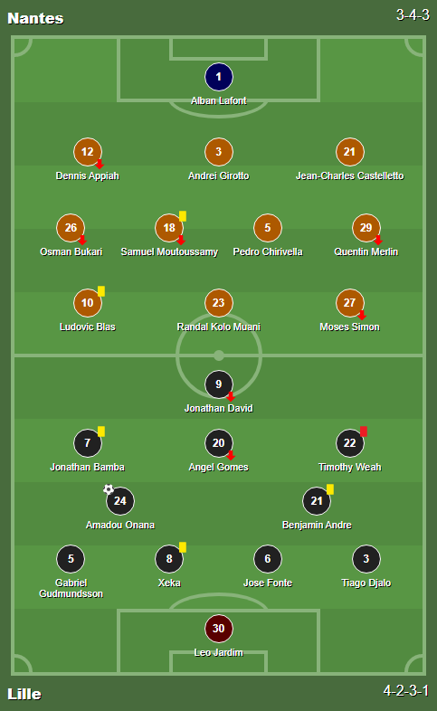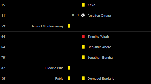 Cards: 15′ Xeka / 53′ Samuel Moutoussamy / 64′ Timothy Weah / 64′ Benjamin Andre / 79′ Jonathan Bamba / 82′ Ludovic Blas / 86′ Fabio Domagoj Bradaric