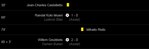 Goals: 30′ 69′ Randal Kolo Muani (Ludovic Blas(Assist)) / 90 + 3′ Willem Geubbels (Osman Bukari(Assist)) /