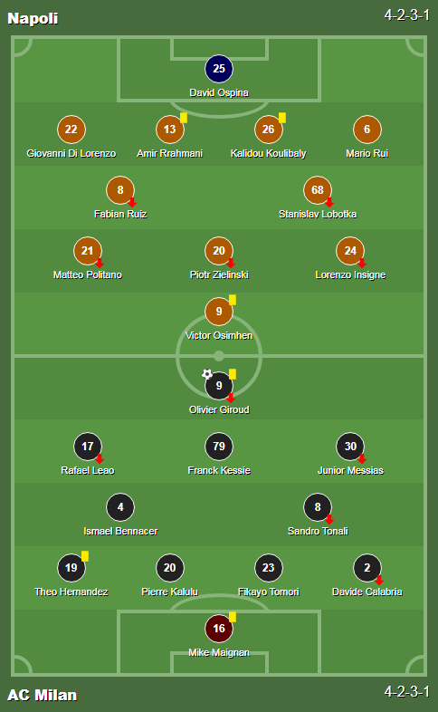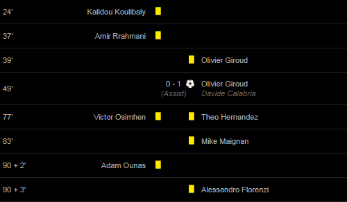 Cards: 24′ Kalidou Koulibaly / 37′ Amir Rrahmani / 39′ Olivier Giroud / 77′ Victor Osimhen Theo Hernandez / 83′ Mike Maignan / 90 + 2′ Adam Ounas / 90 + 3′ Alessandro Florenzi /