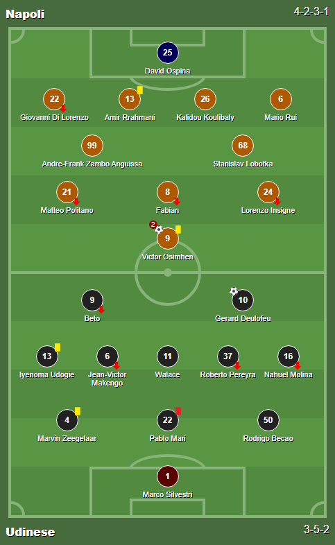 Cards: 45 + 2′ Marvin Zeegelaar / 50′ Iyenoma Udogie / 65′ Amir Rrahmani / 82′ Pablo Mari / 90 + 2′ Victor Osimhen