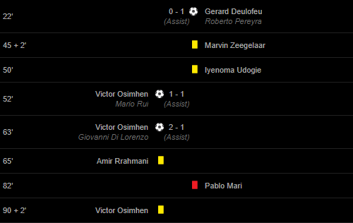 Cards: 45 + 2′ Marvin Zeegelaar / 50′ Iyenoma Udogie / 65′ Amir Rrahmani / 82′ Pablo Mari / 90 + 2′ Victor Osimhen