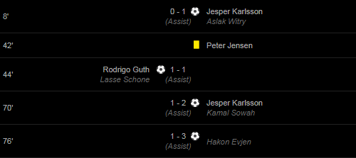 Goals: 8′ ((Assist)Jesper Karlsson) Aslak Witry / 44′ Rodrigo Guth (Lasse Schone(Assist)) / 70′ ((Assist)Jesper Karlsson) Kamal Sowah / 76′ (Assist) /