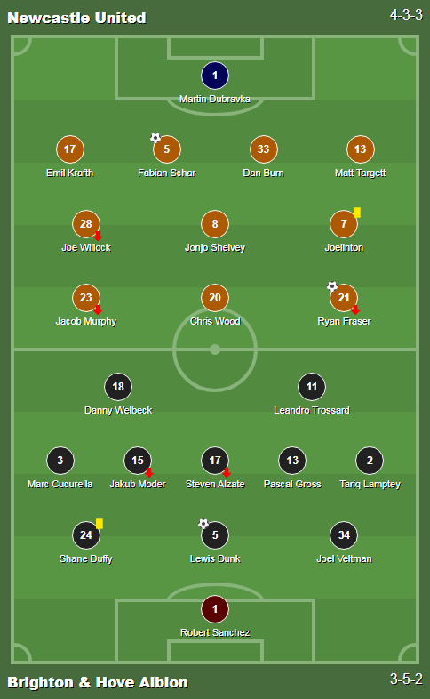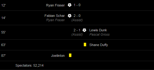 Goals: 12′ Ryan Fraser / 14′ Fabian Schar (Ryan Fraser(Assist)) / 55′ ((Assist)Lewis Dunk) Pascal Gross /