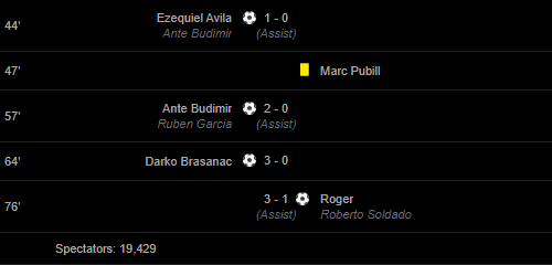 Goals: 44′ Ezequiel Avila (Ante Budimir(Assist)) / 57′ Ante Budimir (Ruben Garcia(Assist)) / 64′ Darko Brasanac / 76′ ((Assist)Roger) Roberto Soldado