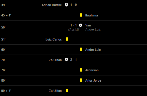 Cards: 45 + 1′ Ibrahima / 51′ Luiz Carlos / 60′ Andre Luis / 76′ Jefferson / 80′ Artur Jorge / 90 + 4′ Ze Uilton /