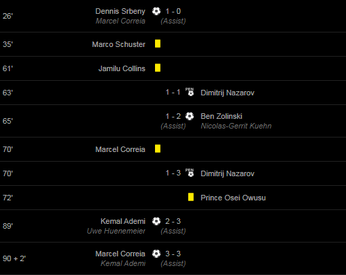 Cards: 35′ Marco Schuster / 61′ Jamilu Collins / 70′ Marcel Correia / 72′ Prince Osei Owusu /