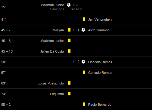 Goals: 25′ Welinton Junior (Carlinhos(Assist)) / 45 + 7′ Willyan / 50′ Goncalo Ramos /