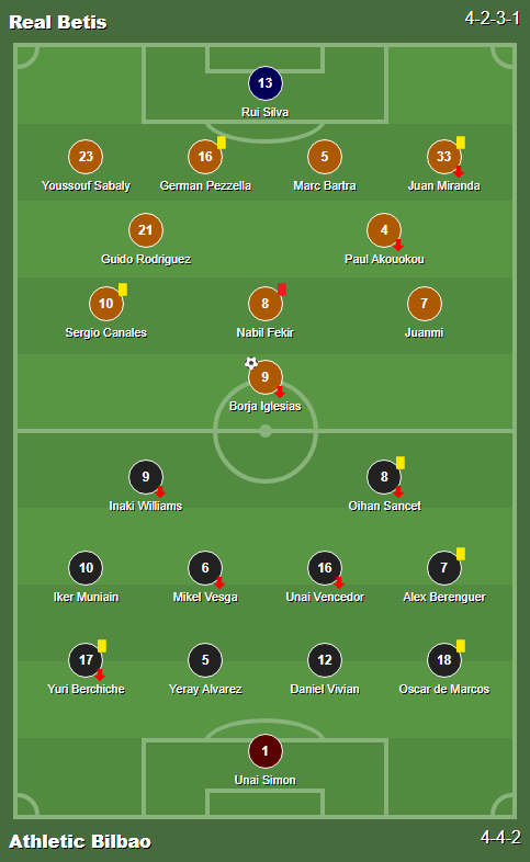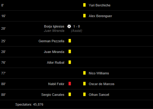 Cards: 8′ Yuri Berchiche / 16′ Alex Berenguer / 25′ German Pezzella / 28′ Juan Miranda / 76′ Aitor Ruibal / 77′ Nico Williams / 80′ Nabil Fekir Oscar de Marcos / 80′ Sergio Canales Oihan Sancet