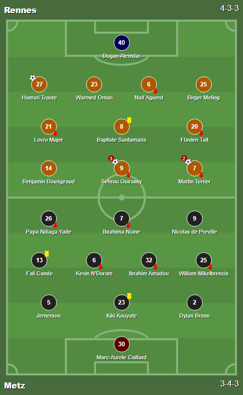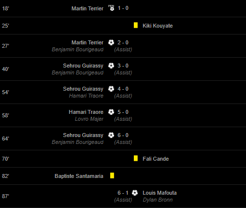 Goals: 18′ Martin Terrier / 27′ Martin Terrier (Benjamin Bourigeaud(Assist)) / 40′ Sehrou Guirassy (Benjamin Bourigeaud(Assist)) / 54′ Sehrou Guirassy (Hamari Traore(Assist)) / 58′ Hamari Traore (Lovro Majer(Assist)) / 64′ Sehrou Guirassy (Benjamin Bourigeaud(Assist)) / 87′ ((Assist)Louis Mafouta) Dylan Bronn