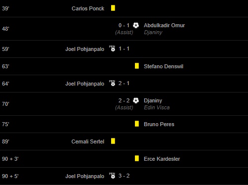 Goals: 48′ ((Assist)Abdulkadir Omur) Djaniny / 59′ Joel Pohjanpalo / 64′ Joel Pohjanpalo / 70′ ((Assist)Djaniny) Edin Visca / 90 + 5′ Joel Pohjanpalo