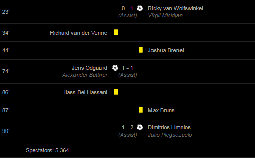 Goals: 23′ ((Assist)Ricky van Wolfswinkel) Virgil Misidjan / 74′ Jens Odgaard (Alexander Buttner(Assist)) / 90′ ((Assist)Dimitrios Limnios) Julio Pleguezuelo /