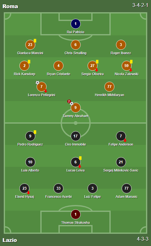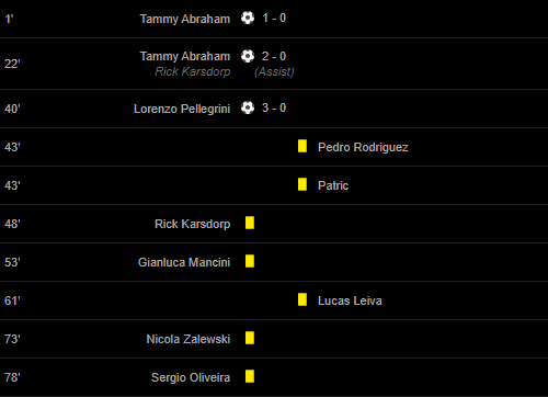 Goals: 1′ Tammy Abraham / 22′ Tammy Abraham (Rick Karsdorp(Assist)) / 40′ Lorenzo Pellegrini