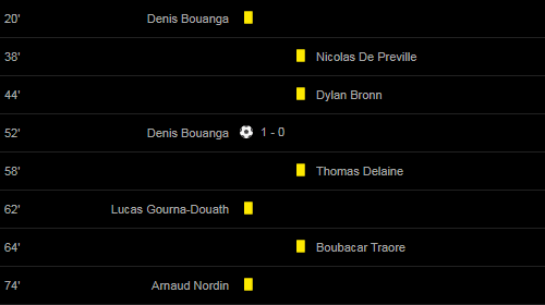 Cards: 20′ Denis Bouanga / 38′ Nicolas De Preville / 44′ Dylan Bronn / 58′ Thomas Delaine / 62′ Lucas Gourna-Douath / 64′ Boubacar Traore / 74′ Arnaud Nordin