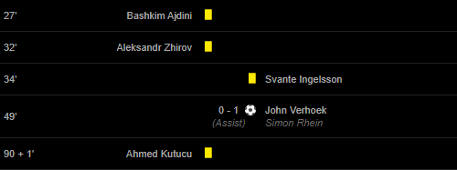 Cards: 27′ Bashkim Ajdini / 32′ Aleksandr Zhirov / 34′ Svante Ingelsson / 90 + 1′ Ahmed Kutucu