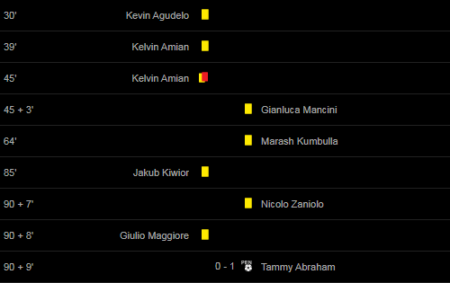 Cards: 30′ Kevin Agudelo / 39′ Kelvin Amian / 45′ Kelvin Amian / 45 + 3′ Gianluca Mancini / 64′ Marash Kumbulla / 85′ Jakub Kiwior / 90 + 7′ Nicolo Zaniolo / 90 + 8′ Giulio Maggiore