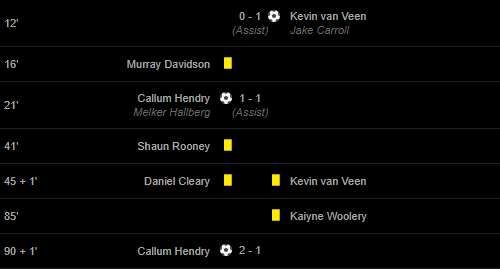 Goals: 12′ ((Assist)Kevin van Veen) Jake Carroll / 21′ Callum Hendry (Melker Hallberg(Assist)) / 90 + 1′ Callum Hendry