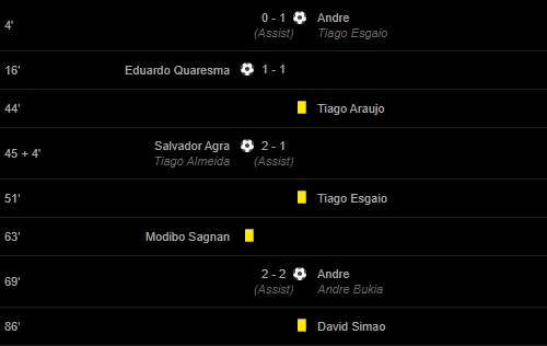 Cards: 44′ Tiago Araujo / 51′ Tiago Esgaio / 63′ Modibo Sagnan / 86′ David Simao