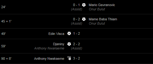 Goals: 24′ ((Assist)Mario Gavranovic) Onur Bulut / 45 + 1′ ((Assist)Mame Baba Thiam) Onur Bulut / 49′ Edin Visca / 59′ Djaniny (Anthony Nwakaeme(Assist)) / 90 + 8′ Anthony Nwakaeme /
