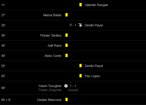 Cards: 11′ Valentin Rongier / 27′ Mama Balde / 36′ Florian Tardieu / 36′ Adil Rami / 49′ Abdu Conte / 55′ Dimitri Payet / 85′ Pau Lopez / 90 + 6′ Giulian Biancone
