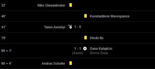 Cards: 32′ Niko Giesselmann / 40′ Konstantinos Mavropanos / 79′ Hiroki Ito / 90 + 4′ Andras Schafer