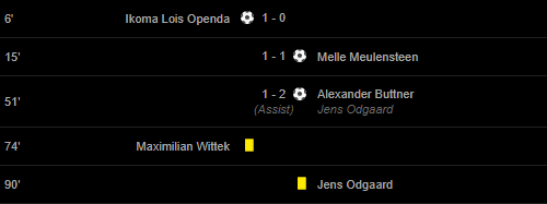 Goals: 6′ Ikoma Lois Openda / 15′ Melle Meulensteen / 51′ ((Assist)Alexander Buttner) Jens Odgaard