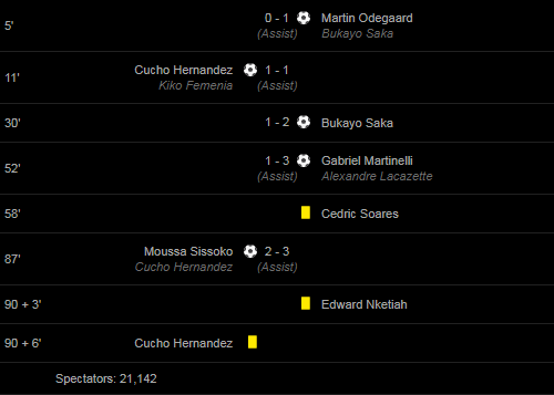 Goals: 5′ ((Assist)Martin Odegaard) Bukayo Saka / 11′ Cucho Hernandez (Kiko Femenia(Assist)) / 30′ Bukayo Saka / 52′ ((Assist)Gabriel Martinelli) Alexandre Lacazette / 87′ Moussa Sissoko (Cucho Hernandez(Assist)) /