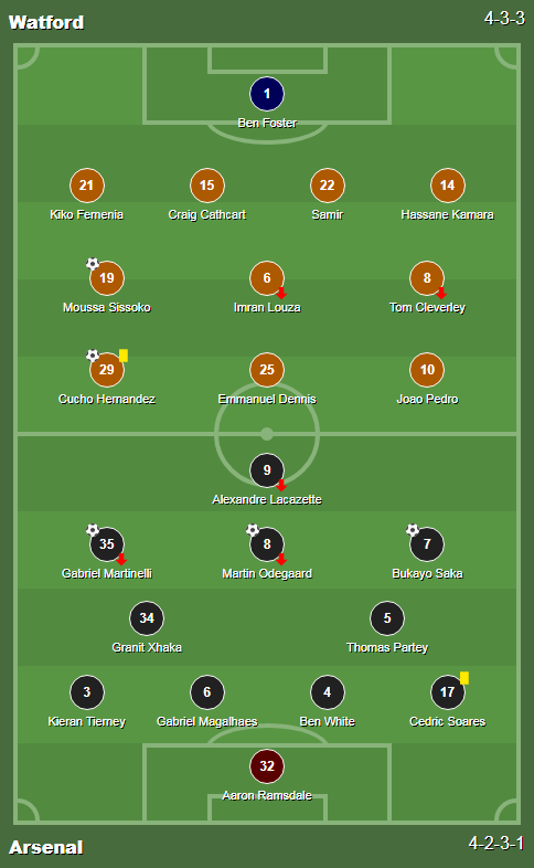 Cards: 58′ Cedric Soares / 90 + 3′ Edward Nketiah / 90 + 6′ Cucho Hernandez