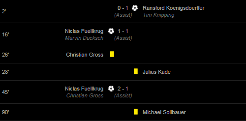 Goals: 2′ ((Assist)Ransford Koenigsdoerffer) Tim Knipping / 16′ Niclas Fuellkrug (Marvin Ducksch(Assist)) / 45′ Niclas Fuellkrug (Christian Gross(Assist)) /