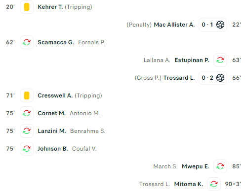Goals: 22′ 0 – 1 Mac Allister A. (Assist Penalty) / 66’0 – 2Trossard L. (Assist Gross P.) /