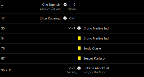 Goals: 7′ Che Nunnely (Leeroy Owusu(Assist)) / 17′ Elton Kabangu / 35′ Bruno Martins Indi / 90 + 1′ ((Assist)Zakaria Aboukhlal) Jesper Karlsson /