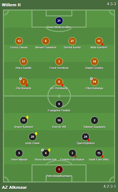 Cards: 54′ Bruno Martins Indi / 76′ Jordy Clasie / 87′ Jesper Karlsson /
